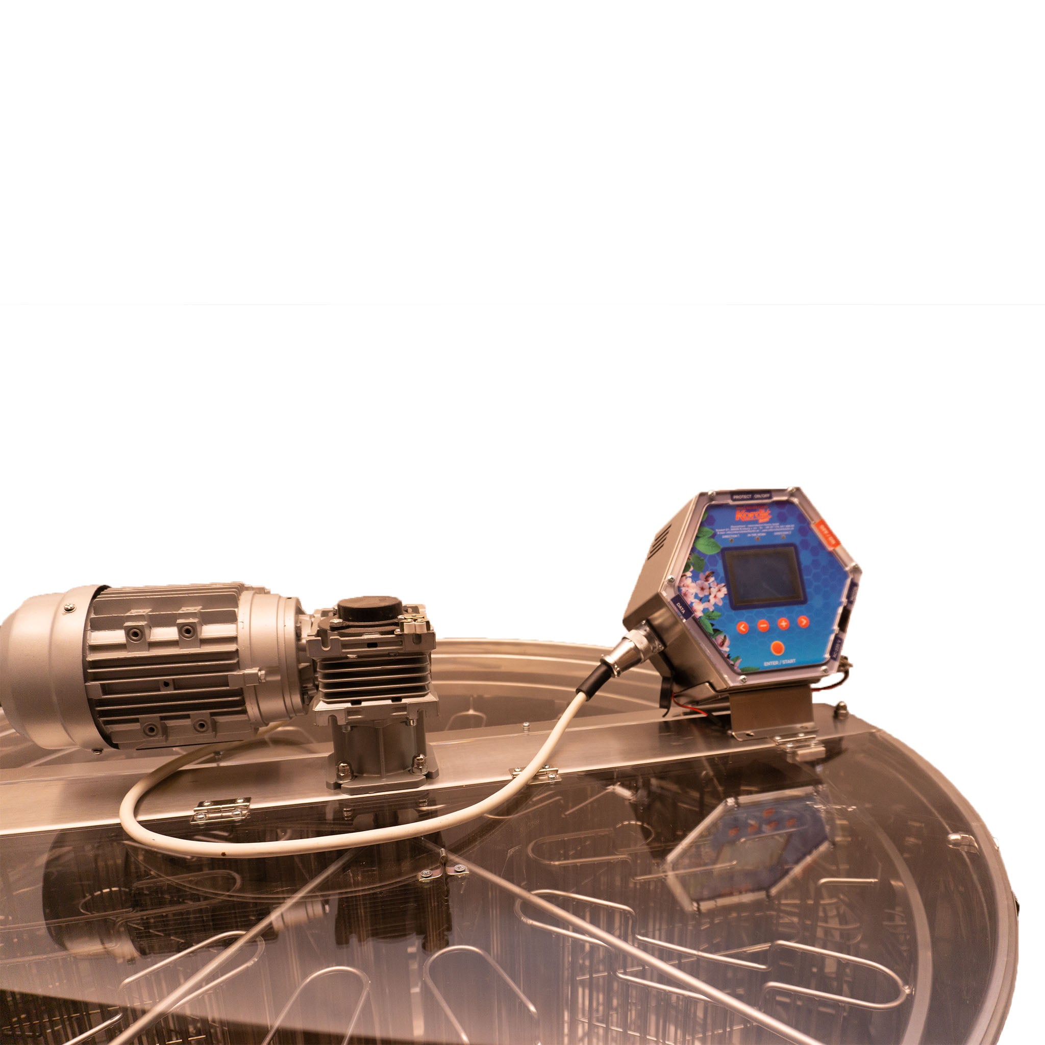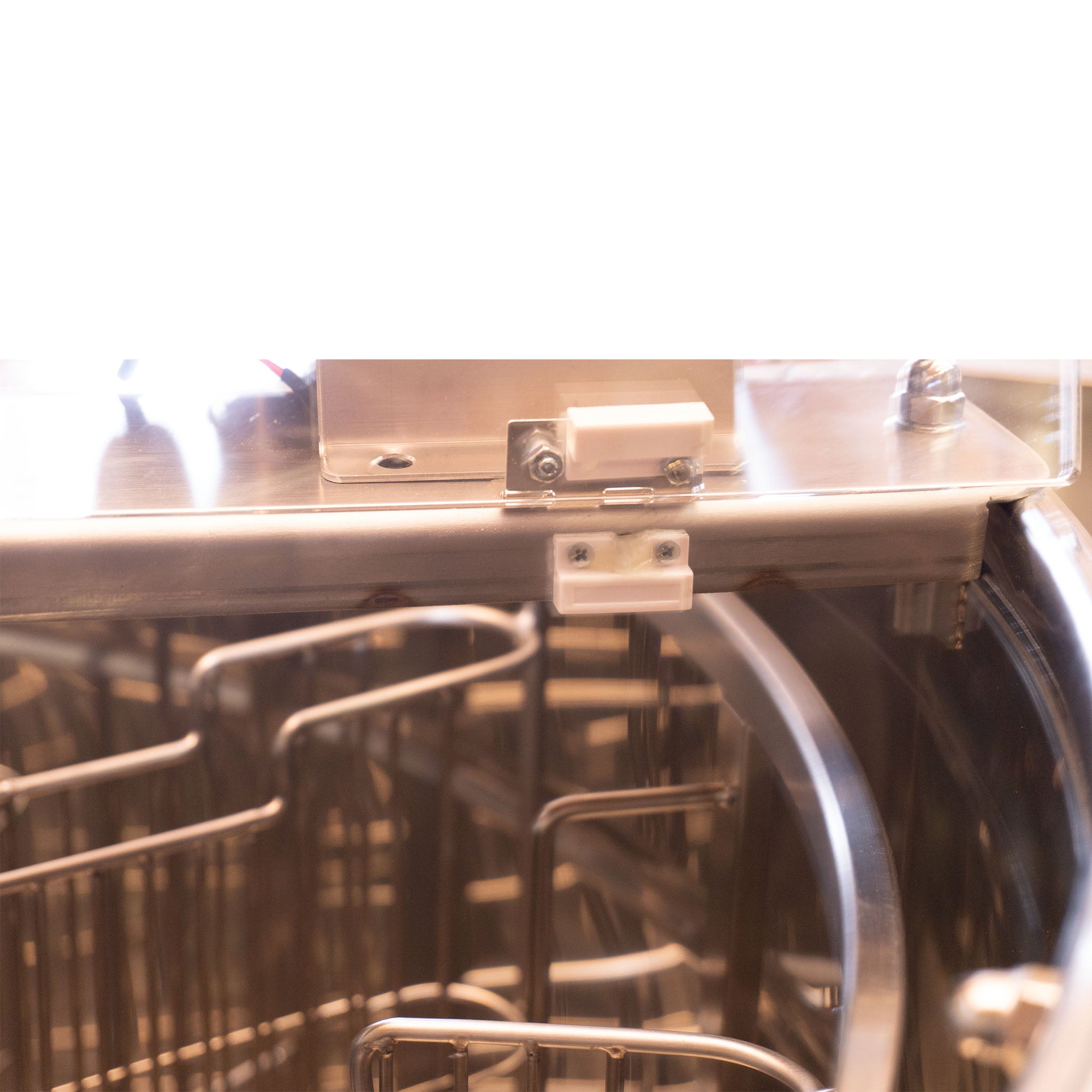 - Der Deckel ist innen mit einem Magnetsensor versehen, welcher die Anlage abschaltet sobald der Deckel geöffnet wird. Die Kassetten für die Rähmchen springen direkt in die Ausgangsposition sobald die Schleuder stoppt